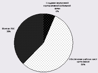 Як бачимо з малюнка 3.4 найбільша доля витрат (56%) доводиться на забезпечення робочих місць оргтехнікою, на монтаж ЛВС потрапляє усього 38%, а на забезпечення корпоративною мобільною святи - 6%.