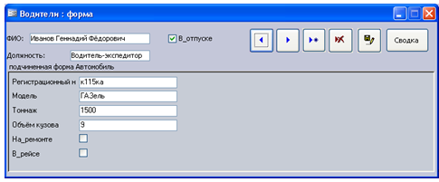 Формы «водители» и «новый_объект» однотипны и отличаются от формы «перевозка» тем, что подчиненные формы представлены там именно в режиме одиночных форм.