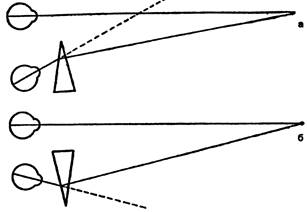 Для компенсации косоглазия, особенно скрытого, могут применяться очки с призматическим действием. Для того чтобы с помощью призмы компенсировать косоглазие, необходимо поставить перед этим глазом призму, основанием направленную в сторону, обратную отклонению глаза. Сила призмы должна соответствовать углу косоглазия. Таким образом, при сходящемся косоглазии основание призмы должно быть направлено к виску, а при расходящемся — к носу (рис. 3).