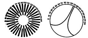 Гипербола толщиной около 0,5 см находится в круге диаметром 18—20 см, который может вращаться. Вокруг круга расположена неподвижная шкала. Обследуемому показывают стреловидную фигуру, установив ее вершину по тому меридиану, который соответствует четкому сектору лучистой фигуры. При этом испытуемый видит всю фигуру размытой, за исключением маленького четкого участка вблизи вершины стрелы. Осторожными поворотами перемещают четкий участок лучистой фигуры точно на ее вершину. При этом стрела укажет положение одного из главных меридианов глаза. После этого приступают к определению степени астигматизма.