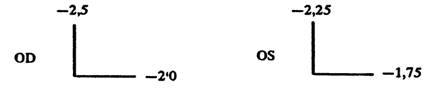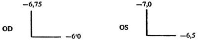 Пример 7. 6 лет. Снижение зрения обнаружено при осмотре в детском саду. VOD = 0,3; VOS = 0,2. Сферические линзы зрения не улучшают. Проведена 3-дневная атропинизация. Скиаскопически определена рефракция:
