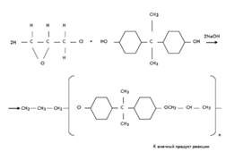 Эпоксидная смола — олигомеры, содержащие эпоксидные группы и способные под действием отвердителей (полиаминов и др.) образовывать сшитые полимеры. Наибольшее практическое и широкое применение для получения эпоксидных смол нашли дифенилолпропан (диан или бнсфенол А) и эпихлоргидрин. Реакция получения эпоксидной смолы протекает по схеме, изображенной на рис. 1.