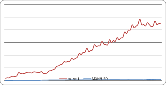 За рассматриваемый период денежная масса в Мексике увеличивалась более быстрыми темпами, чем в США. Таким образом, дифференциал денежной массы увеличивался, что в соотвествии с монетарным подходом должно приводить к девальвации валюты. На практике мы видим рост курса в период с 1994 по 2008 гг., однако со значительным колебаниями, и затем после небольшого падения, новый скачок в конце 2008г. в связи с кризисом. Таким образом, несмотря на наличие очевидной зависимости между уровнями денежной массы и влютным курсом, монетарный подход объясняет не все колебания валютного курса мексиканского песо.