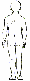 Нормальная осанка дошкольника. Грудная клетка симметрична, плечи не выступают кпереди, лопатки слегка выступают назад, живот выдается вперед, ноги выпрямлены, намечается поясничный лордоз. Остистые отростки позвонков расположены по средней линии спины.