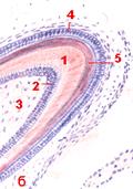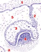 : 1- дентин, 2 - одонтобласты, 3 - пульпа зуба, 4 - энамелобласты, 5 эмаль.