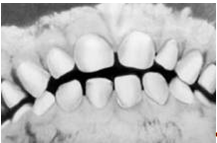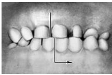 Во второй класс включены аномалии, при которых нарушено смыкание первых моляров и фронтальной группы зубов. Межбугорковая фиссура первого моляра нижней челюсти располагается позади мезиально-щечного бугра первого моляра верхней челюсти, т.е. нарушено смыкание зубов в сагиттальной плоскости (переднезаднем направлении). Подобные нарушения (так называемый дистальный прикус) могут быть обусловлены чрезмерным ростом верхней челюсти (прогнатией) или (реже) недоразвитием нижней челюсти (микрогенией). В зависимости от положения и смыкания фронтальной группы зубов во втором классе выделяют два подкласса: первый характеризуется протрузией резцов (рис. 6, б), второй — их ретрузией (рис. 6, в).