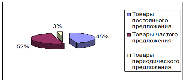Как видно из табл. 24, товаров редкого предложения и товаров, отсутствующих в продаже по мнению покупателей в данной товарной группе нет. Причем, наибольшим удельным весом в группе обладают товары частого предложения.