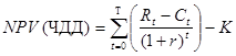 1. Чистая текущая стоимость (NPV) или чистый дисконтированный доход (ЧДД). Чистая текущая стоимость характеризует эффект от реализации проекта, приведенный к начальному моменту времени. Если чистая текущая стоимость проекта положительна, это свидетельствует о наличии реального дохода от его реализации.