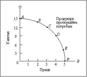 Отже, А. Маршалл розглядав ринкову вартість як категорію короткого періоду, що діє на рівні підприємства. Проте, на наш погляд, є можливість розглядати вартість у контексті «нормальної вартості» і в короткому періоді теж, тобто в даний час. Для цього нам треба досліджувати модель межі виробничих можливостей, в якій об’єктами аналізу є не продукти, а залучені до виробничого процесу основні чинники виробництва — робоча сила, з одного боку, і засоби виробництва — з іншого. Модель матиме такий вигляд (див. рис. 5.1).