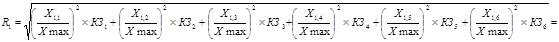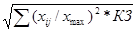 2) стандартизуем показатель путём деления каждого показателя на лучший, возведя в квадрат;