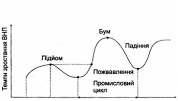 За тривалістю економічні цикли поділяють на короткі (малі), якщо коливання ділової активності триває 2–3 роки; середні, якщо коливання ділової активності триває 8–10 років; довгі (великі хвилі Кондратьєва), якщо коливання ділової активності триває 48 – 55 років. Короткі (малі) цикли пов’язані з відновленням рівноваги на споживчому ринку. Середні (промислові) цикли пов’язані зі зміною попиту на засоби виробництва. Матеріальною основою періодичності середніх циклів є необхідність оновлення основного капіталу. Особливістю промислового циклу є коливання темпів зростання ВНП за період часу, коли економічна система проходить чотири послідовні фази: пожвавлення, підйом, бум, падіння (рис. 5.1).