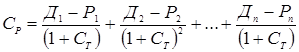 где Д, Р — доходы (притоки) или расходы (оттоки) финансовых средств; Ст — коэффициент дисконтирования (аналог ставки процента либо коэффициента экономической эффективности); п — число лет.
