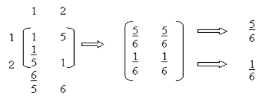 Построим матрицу предпочтений для оценки важности критериев. При этом элементы строки сравниваются с элементами столбца по критериям. При сравнении элемента с самим собой берется ранг, равный единице. При сравнении элементов столбца с элементами строки – обратная величина. Последняя величина в столбце – сумма элементов (расчеты опираются на представление о матрице как о двумерной дискретной случайной величине).