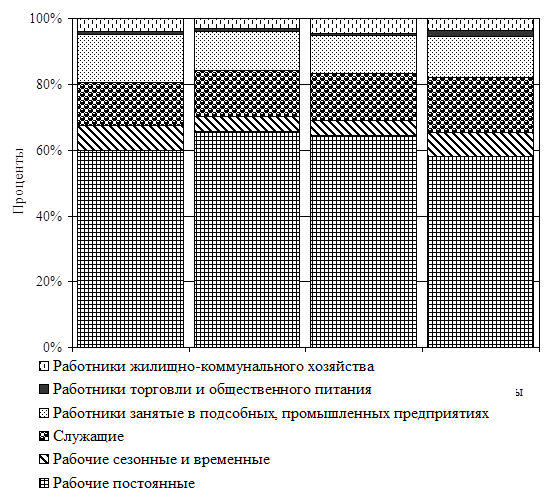 Рабочие - это работники, непосредственно занятые производством продукции (услуг), ремонтом, перемещением грузов и т.п. К ним также относятся уборщицы, дворники, гардеробщики, охранники [32].