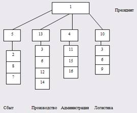 Структура коммуникационных сетей в компании "Галакта" не достаточно развита. В компании вместо 3-х формальных групп образовано 4 неформальных. Группы А, Б и Г общаются между собой, а группа В общается с другими группами только лишь посредством руководителя компании. Таким образом, будет целесообразно провести в компании реструктуризацию. Выделить в компании 4 отдела. 1-ый отдел – сбыта (2, 5, 8, 7). Руководителем отдела назначить сотрудника № 5, так как он является лидером мнения в этой группе. Второй отдел – производства. Руководителем этого отдела будет сотрудник № 4 (он и является формальным руководителем). Третий отдел – административный. Руководителем этого отдела будет сотрудник № 3 (он и является формальным руководителем). Сотрудники № 3, 14, 13, 12, 6. Четвертый отдел – логистики. Руководителем этого отдела будет сотрудник № 10, так как он регулирует всю информацию, поступающую в группу. Организационная структура компании будет иерархический и будет выглядеть следующим образом.