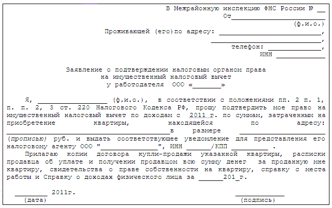 5.1. Имущественный налоговый вычет предоставляется налогоплательщику налоговыми органами на основании письменного заявления налогоплательщика в налоговую инспекцию по месту регистрации, с приложением всех вышеперечисленных документов, например: