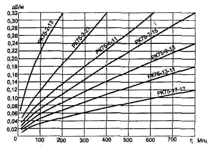 На рисунке приведены зависимости удельного затухания коаксиальных кабелей разных марок от частоты. Пользуясь ими, можно подсчитать затухание сигнала в кабеле, при известной его длине, на любой частоте.
