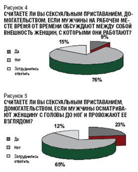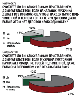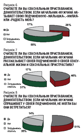 Территория харассмента, по данным массового опроса. Дополнить картину хотелось бы данными количественного опроса 2006 г. (ссылку на него см. выше). Графики даны в такой последовательности, чтобы представить общественное мнение о том, что есть сексуальное приставание, по нарастающей. Порог (свыше 50%) преодолен только на рисунке 8.