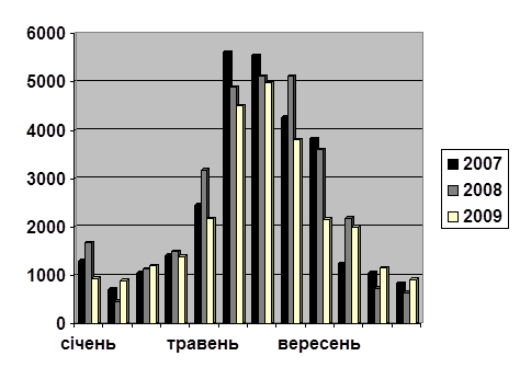 У таблицю 2.4.1. внесені дані про виручку за 3 роки 2007, 2008 і 2009. а також за кожен місяць окремо, що дозволяє нам побачити який прибуток отримав магазин не тільки за рік у цілому, але і за кожний місяць окремо. Крім того в таблиці порахована місячна сума за три роки, що дозволяє нам визначити сезонність. Завдяки графіку ми можемо наочно побачити в які місяці року прибуток магазину висока, а в які низька. Завдяки таким підрахунками можна зробити висновки, що в літній час продажів більше, а значить завозити товару також треба більше, ніж у зимовий час, коли рівень продажів низький.