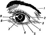 1 – брова, 2 – верхня повіка, 3 – склера, покрита кон'юктивою, 4 – зовнішній кут повік, 5 – нижня повіка, 6 – зіниця, 7 – райдужна оболонка, 8 – рогова оболонка, 9 – внутрішній кут повік