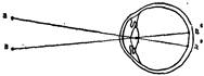 У короткозорому оці паралельні промені, що йдуть від далеких предметів, перетинаються попереду сітківки, не доходячи до неї (рис. 5, в). Такому оку, заломлююча здатність якого і без того велика, акомодація допомогти не в змозі.