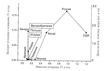 Несмотря на значительное количество рассеянного в атмосферу углерода, Россия, благодаря большой территории, занимает лидирующее положение в очистке с помощью осадков (рис. 1), а следовательно, должна рассчитывать на самое значительное - 2,81 млрд дол. в год денежное вознаграждение. Для наиболее благополучной из европейских стран - Франции - величина положенных поощрительных квот в 31,2 раза меньше, чем для России. Это несмотря на то, что промышленность России в 1990 г. выбрасывала в атмосферу углерода в 6,2 раза больше, чем промышленность Франции". В отличие от занимающих высокие места Канады, США и Китая, Россия является крупным экспортером нефти и природного газа, и увеличение цены на углеродное топливо, связанное с введением налогов на «засорение» атмосферы, не только не ударит по экономике страны, но и приведет к существенному притоку капитала.