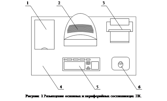 1 – сканер, 2 – монитор, 3 – принтер, 4 – поверхность рабочего стола,5 – клавиатура, 6 – манипулятор типа “мышь”.