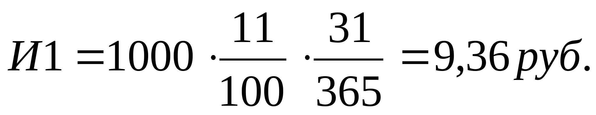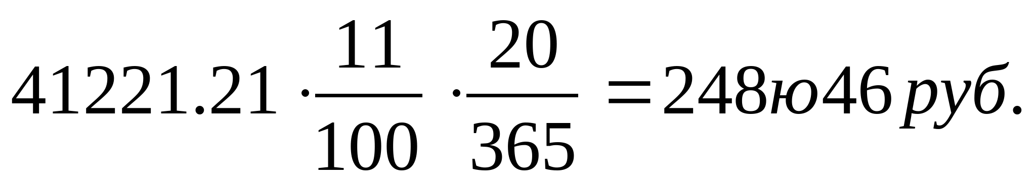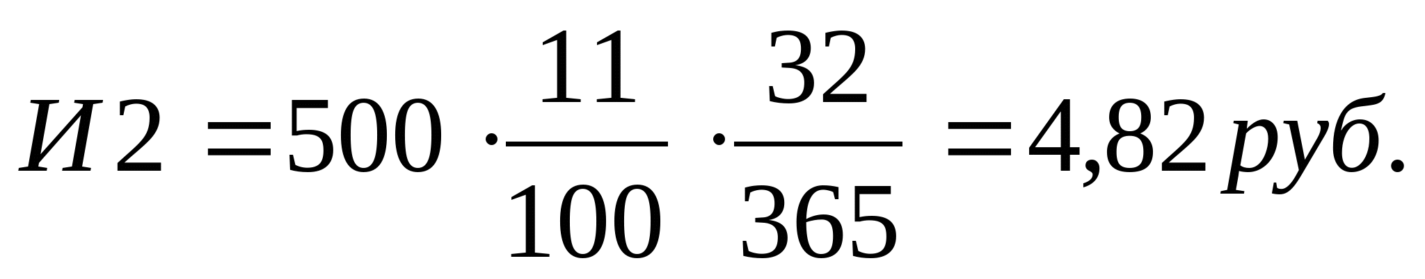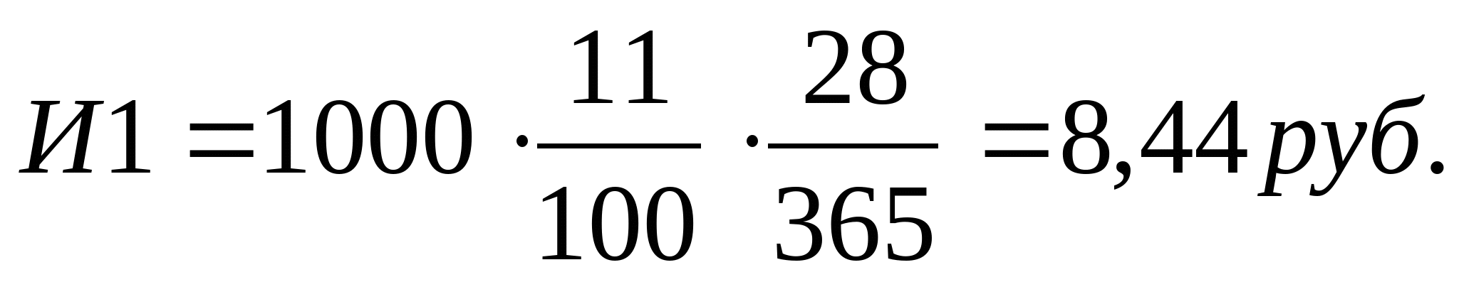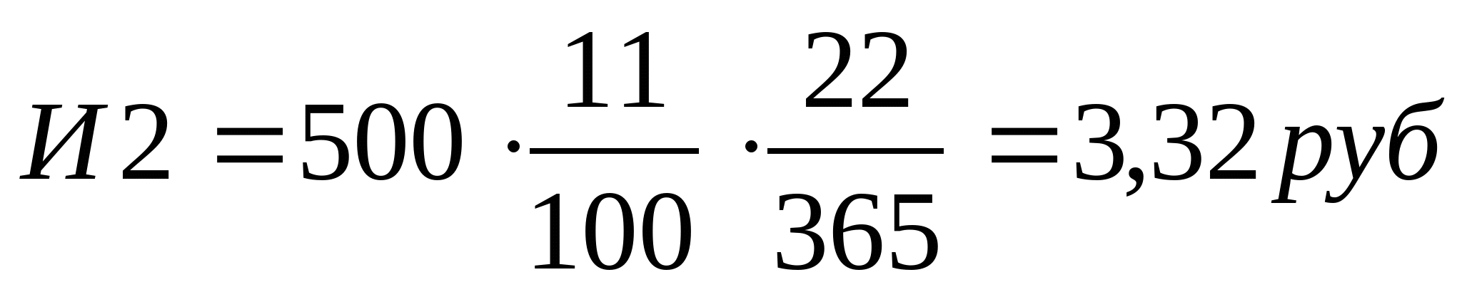 где 1000 - сумма первоначального взноса, 11 - годовая процентная ставка, 28 - количество дней с 5 января по 4 февраля (включительно), 365 - количество дней в году. На сумму дополнительного взноса:  где 500 - сумма первоначального взноса, 11 - годовая процентная ставка, 22 - количество дней с 11 февраля по 4 марта (включительно), 365 - количество дней в году. Общая сумма процентов, подлежащих выплате, составит 11,76 руб. (8,44+2,32). Сумма процентов, подлежащих причислению к остатку вклада по истечении срока 5 апреля 2001 г., будет равна: на сумму первоначального взноса: