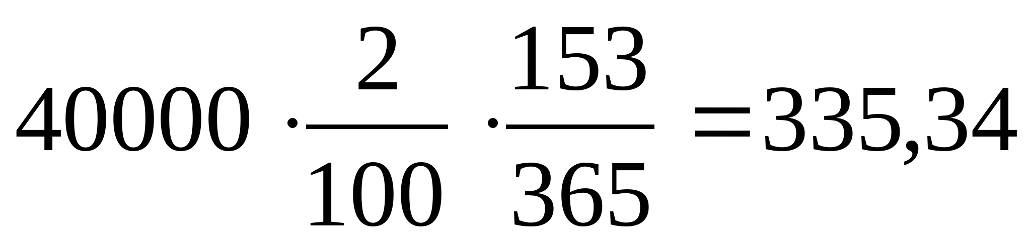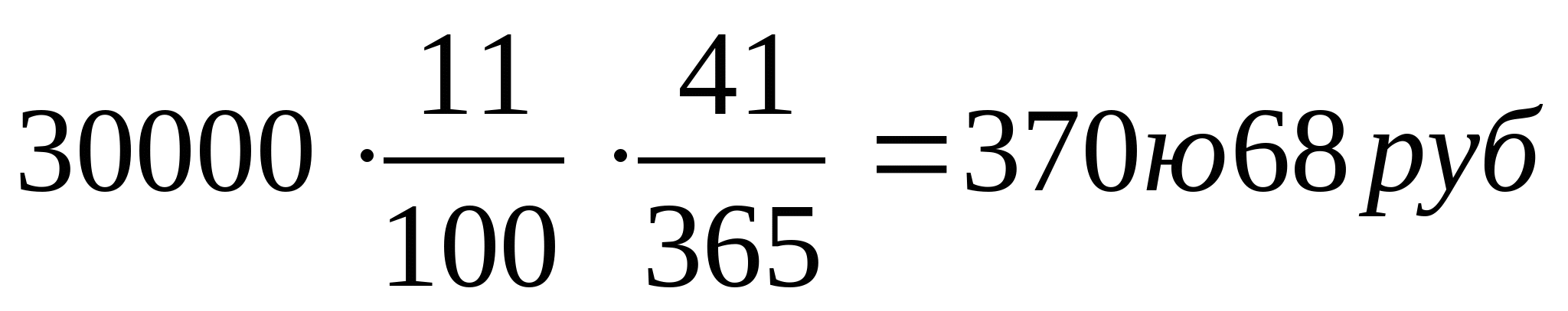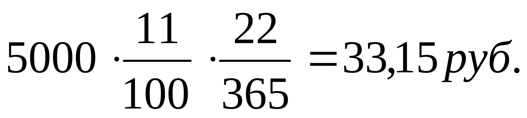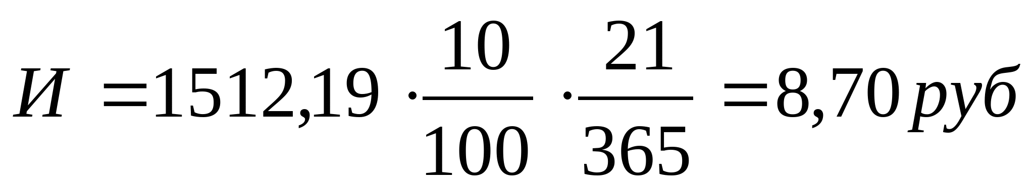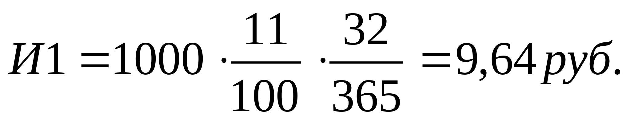 где 1000 - сумма первоначального взноса, 11 - годовая процентная ставка, 28 - количество дней с 5 января по 4 февраля (включительно), 365 - количество дней в году. На сумму дополнительного взноса:  где 500 - сумма первоначального взноса, 11 - годовая процентная ставка, 22 - количество дней с 11 февраля по 4 марта (включительно), 365 - количество дней в году. Общая сумма процентов, подлежащих выплате, составит 11,76 руб. (8,44+2,32). Сумма процентов, подлежащих причислению к остатку вклада по истечении срока 5 апреля 2001 г., будет равна: на сумму первоначального взноса: