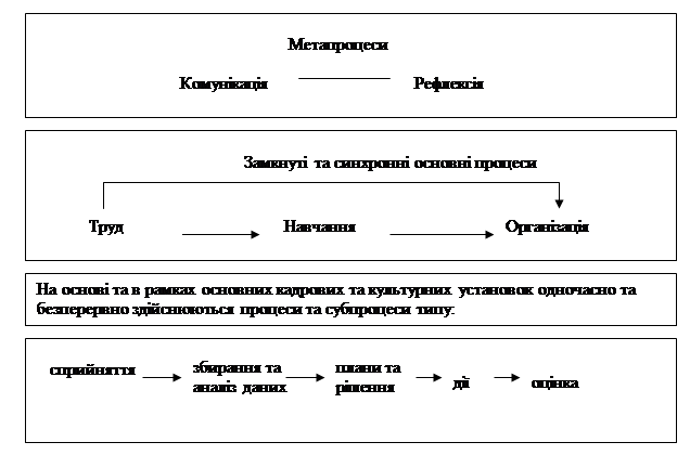 У ході субпроцеса "планування і прийняття рішень" особливо виразно виявляється необхідність нової парадигми управління знаннями, що виключила б сегментування праці, навчання й організаційного процесу. Ці три основних процеси виявляться ефективними, якщо вони будуть інтегровані, тобто синхронізовані й ув'язані один з одним. Стратегічне значення процесу "організація" у виді планів і рішень у рамках процесів "праця" і "навчання" стає відразу ж очевидним, якщо він не обмежується індивідуальним (персональним) рівнем, а переходить на груповий (культурний) і інституціональний (політичний) рівні. Саме в цьому і полягає головна задача управління знаннями на підприємстві.