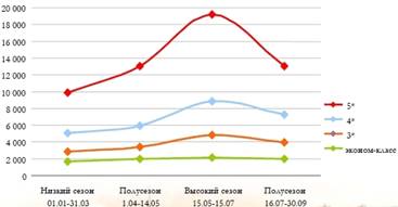 Рис.2. Стоимость проживания в гостинице в зависимости от класса, руб. в сутки