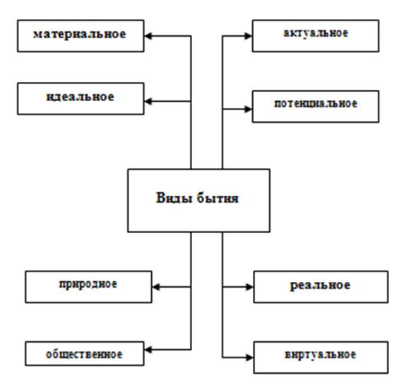 1. Бытие вещей (тел), процессов, которое в свою очередь делится на Бытие вещей, процессов, состояние природы, Бытие природы как целого и Бытие вещей и процессов, сотворенных человеком;