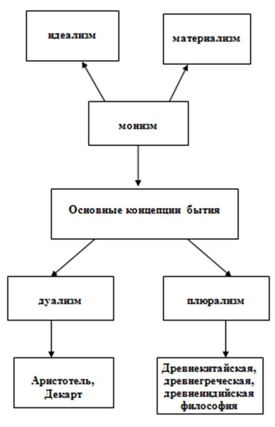 Плюрализм в философском смысле означает признание множество субстанций. Дуализм – исходит из двух основ, двух субстанций, одна из которых материальная, другая – идеальная. Учение, признающее одну субстанцию, называются монистическими. Они представляют монизм. Религиозные философы, например В.С.Соловьев, считал, что краеугольным камнем "философии единства" должно быть признание своего одушевленным. Факт внешнего, материального отношения есть внутреннее отражение внутреннего, психического состояния существа.