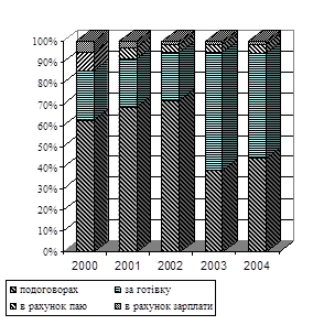 Щодо складу виручки, то в середньому питома вага виручки по договорах складала до 2003 року 62-73 %, а вже в період з 2003 року до 2004 року складає лише 39-45 %. Відповідно питома вага виручки за готівку складало в період з 2000до 2003 року 19-23 %, а вже в 2003-2004 році ситуація змінилась і питома вага дорівнювала 51-55 %. Питома вага виручки в рахунок зарплати складає 2,6-5 % від загального обсягу виручки. у період з 2000 до2003 року виручка від рахунку паю складає 3,6-5,7 % .