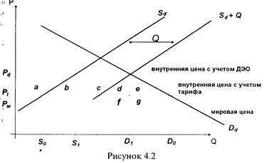 В условиях свободной конкуренции результаты воздействия квоты и тарифа на уровень благосостояния идентичны. На рис. 1.2 квота привела к росту отечественного производства с уровня S0