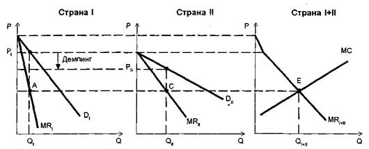 на внешнем, для него более эластичном рынке страны II. В результате возникает ценовая дискриминация местных потребителей, которые вынуждены покупать товар по более высоким ценам, и зарубежных производителей, которые сталкиваются с нечестной конкуренцией со стороны импортных товаров. Производитель, осуществляющий такую ценовую дискриминацию, может быть обвинен в демпинге. В числовом выражении выгодность демпинга нетрудно доказать.