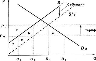 Однако существо проблемы заключается в том, что отечественное производство нуждается в защите в силу своей недостаточной эффективности, и политика протекционизма, ограничивая конкуренцию, создает условия для сохранения такого положения. Кроме того, хотя импорт сокращает занятость в импортозамещающих отраслях, но одновременно он создает и новую занятость (ввязанную, например, с закупкой, продажей, послепродажным Обслуживанием импортной продукции). Наконец, государство может обеспечить поддержку отечественных производителей и более эффективным, чем протекционизм, методом, с меньшими потерями для благосостояния общества. На рисунке 3.1 показаны в сравнении последствия установления таможенного тарифа и предоставления эквивалентной субсидии производителям. Если сохраняется режим свободной внешней торговли и производители поолучают субсидию, то увеличение отечественного производства досчитается без повышения цен, и следовательно, потребители потерь не несут. Выигрыш производителей составляет область (с + d), а затраты государства на субсидию — область (а + b) = (b + с + d). Таким образом, общие потери от предоставления субсидии составят область b, тогда как потери от введения тарифа больше и составляют область (b + е).