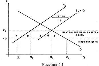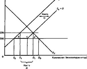 ; во что это обошлось стране, показывает область b, поскольку предельные издержки производства отечественных велосипедов возросли при этом до 220 долл., а в отсутствие квоты этот товар мог быть приобретен за границей по цене 200 долл. В то же время потребители терпят ущерб, равный площади области d, которая не выражает чьего-либо выигрыша. Наценка на разрешенный импорт (или фигура с) есть внутреннее перераспределение доходов от потребителей в пользу тех, кто так или иначе ведает лицензиями. Таким образом, чистый национальный ущерб составится из областей b и d.