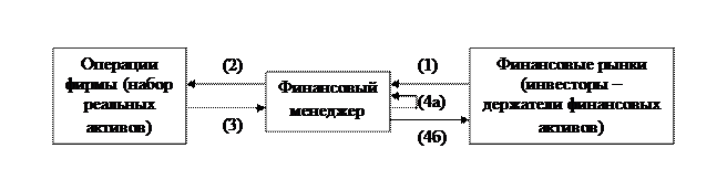 Рис. 1.1.1 Денежные потоки между финансовыми рынками и фирмой. Обозначения: (1) фирма привлекает деньги продажей финансовых активов инвесторам; (2) деньги инвестируются в деятельность фирмы и идут на приобретение реальных активов; (3) деятельность фирмы создает деньги; (4а) деньги реинвестируются; (4б) деньги возвращаются инвесторам