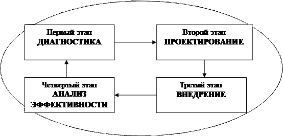 Этапы взаимосвязаны и образуют замкнутый цикл, в котором оценка результатов внедрения является материалом для дальнейшего моделирования изменений и улучшений действующей модели.(Рис. 1.3.)