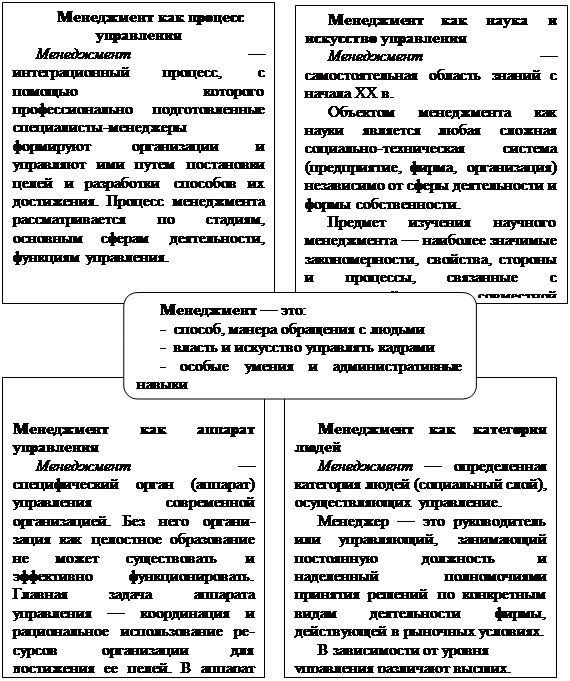 «Менеджмент представляет собой функцию управленческого аппарата развитого современного производства по использованию законов и закономерностей общественного развития, позволяющую организовать эффективное, конкурентоспособное производство в условиях постоянно меняющейся внутренней и внешней среды жизнедеятельности. Осуществление данной функции неизбежно предполагает и приводит к возникновению и воспроизводству определённых социально-экономических отношений, выступающих общественной формой организации эффективного, конкурентоспособного индивидуального производства». [ ]