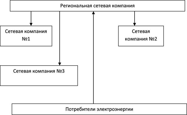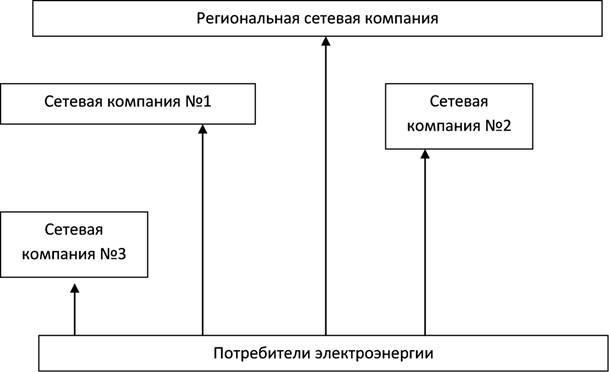 Пояснение: характеризуется отсутствием договорных отношений между сетевыми организациями, используется для установления тарифов в соответствии с п. 119 ППРФ №530 от 31.08.2006 г. В этом случае для сетевых организаций устанавливаются тарифы на передачу, на основании которых сбытовая компания (гарантирующий поставщик) оплачивает им услуги по передаче для покрытия их НВВ и расходов на компенсацию потерь.