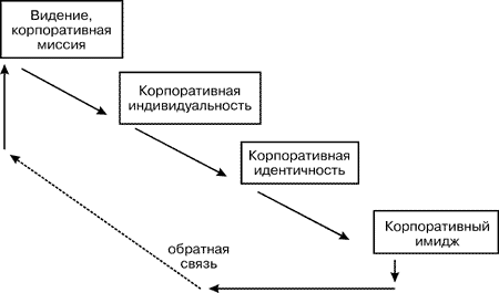 Процесс управления корпоративным имиджем начинается задолго до разработки визуальных атрибутов организации (логотип, фирменных бланков, интерьера, внешнего вида и манер сотрудников). Он начинается с формулировки видения, а затем миссии как социально-значимого статуса организации (рис. 2). Затем определяется корпоративная индивидуальность, или “личность” организации.