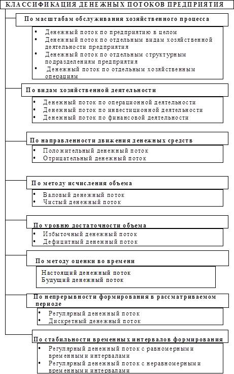 Осуществление практически всех видов финансовых операций предприятия генерирует определенное движение денежных средств в форме их поступления или расходования. Это движение денежных средств функционирующего предприятия во времени представляет собой непрерывный процесс и определяется понятием “денежный поток”.