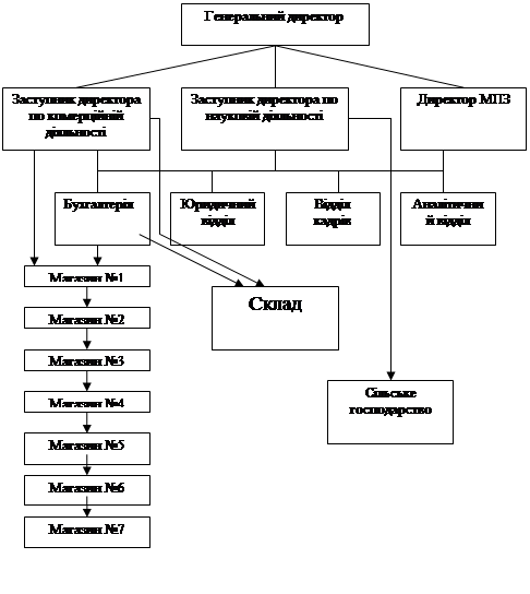 Організаційна структура управління підприємства „Колос” є лінійно штабна. Оперативне керівництво діяльністю підприємства виконує генеральний директор, якому підпорядковуються: заступник директора по комерційній діяльності, заступник директора по науковій діяльності, директор МПЗ, головний бухгалтер, Юридичний віддділ, Відділ кадрів та Аналітичний відділ. Заступнику директора по комерційній діяльності та головному бухгалтеру підпорядковуються всі магазини та склади, а заступнику директора по науковій діяльності підпорядковується все сільське господарство. (див. мал.нижче). Організація господарської діяльності на підприємстві проводиться з урахуванням всіх служб і підрозділів котрі є на ньому.