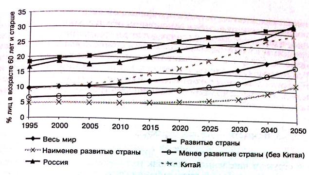 За 1897-1959 гг. доля лиц в возрасте 60 лет и старше увеличилась только с 7 до 9%, т.е. российское население продолжало в общем оставаться молодым. Однако быстрое падение рождаемости в 1960-е и последующие годы привело к тому, что население России стало стремительно стареть: по данным переписи населения 1989 г., эта доля превысила 15%, а к началу 2001 г. достигла 18,7% (среди мужчин эта доля составляет 13,9%, среди женщин — 23,0%). Это означает, что сегодня практически каждый пятый житель нашей страны имеет возраст старше 60 лет. Иначе говоря, население России в отношении старения «опережает» данные процитированного выше прогноза ООН.