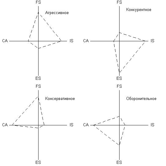 Если максимально удаленной от центра координат является сторона в квадранте FS—IS, то компания находится в агрессивном стратегическом состоянии. Если максимально удалена сторона в квадранте IS—ES, то компания находится в конкурентном стратегическом состоянии. Если максимально удалена сторона в квадранте CA—FS, то компания находится в консервативном стратегическом состоянии. Если максимально удалена сторона в квадранте CA—ES, то компания находится в оборонительном стратегическом состоянии.