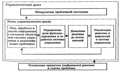 Решение проблемы представляет процесс, состоящий из последовательности сменяющих друг друга действий. Процесс начинается с момента возникновения (обнаружения) проблемной ситуации и завершается реализацией выбранного решения и оценкой результата снятия проблемы. Период времени от обнаружения проблемы до реализации решения, снимающего (разрешающего) проблему, называют управленческим циклом. Основные этапы управленческого цикла приведены на рис.1.