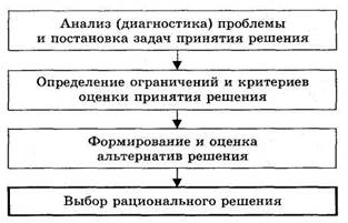Принятие решения представляет собой процесс, реализуемый поэтапно. Основными этапами этого процесса являются: диагностика проблемы и формулирование целей принимаемого решения, формулирование ограничений и критериев оценки выбора при принятии решения, определение альтернативных вариантов возможного решения, их оценка и выбор рационального решения. Процесс принятия рационального решения с учетом указанных основных элементов может быть представлен упрощенным алгоритмом, приведенным на рис.2.