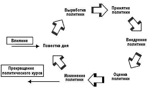 В теории публичной политики выделяются два вида таких поставленных проблем («повесток»): те, которые находятся под контролем власти и решаются властями, и те, которые возникают в обществе, но пока не получили политического внимания. Второй вид проблем влияет на первый, но может долгое время не получать своего разрешения в политике. После того как проблема вышла на повестку дня государственных органов, начинается процесс выработки политики – согласования интересов, определения целей и средств их достижения. Разработанный политический курс должен получить закрепление в целом ряде решений и программ, что само по себе является довольно сложным процессом нахождения компромиссов и соглашений. Политический курс институционализируется в решениях определенными органами государственной власти и с использованием определенных процедур (президент, правительство, парламент, референдум). Определенная и закрепленная в решениях политика должна быть осуществлена, что предполагает целый комплекс мер по внедрению принятых решений и программ. Эти меры касаются деятельности государственных органов, бизнеса, структур гражданского общества. Торможение принятых решений может осуществляться на любом уровне и в любой области, если не разработана система внедрения политики. Оценивание политики представляет собой относительно самостоятельный этап политического цикла, и он направлен на проверку эффективности и качества /c. 84/ выработанного политического курса, который уже осуществляется в действительности. Конечно, оценивание присутствует и на ранних этапах политического процесса, но здесь оно приобретает самостоятельное значение. Как правило, оценивание политического курса – это самостоятельная профессиональная деятельность экспертов и соответствующих агентств. Оценка политики приводит либо к корректировке (изменению) политики, либо к отказу от политического курса.